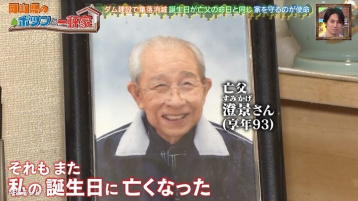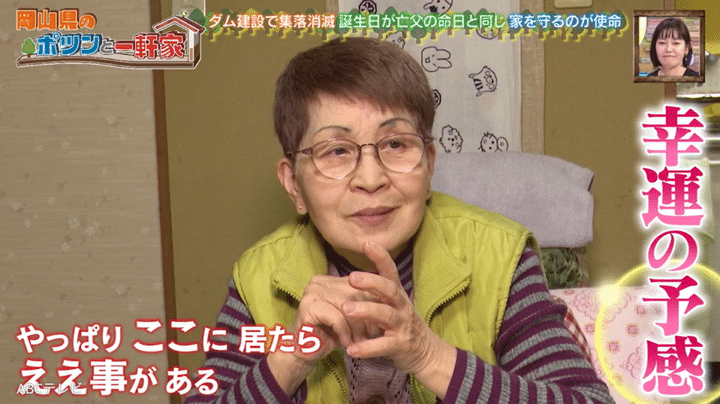 女性は中学を卒業した後に、岡山県内の縫製工場に就職。20歳で結婚し津山市へ移り、3人の子宝に恵まれたが、末娘が高校を卒業した後に離婚。病院で介護士として働きながら1人で暮らし、14年前60歳で病院を退職したのを機に、80歳を超えた両親を介護するため、この「ダムの上のポツンと一軒家」に戻ってきた。