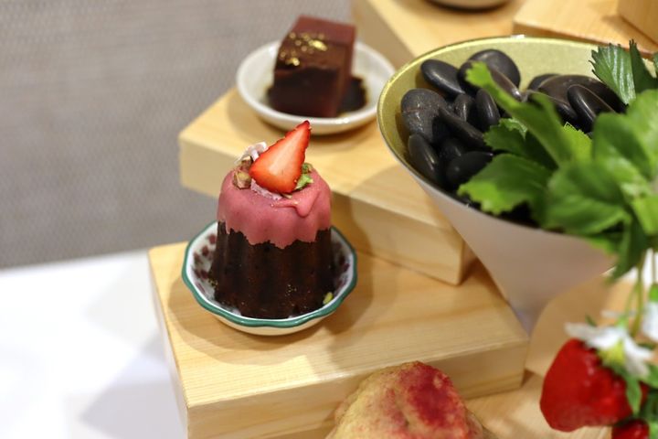スイーツは5種類で、「苺のマカロン」「苺のカヌレ」「苺のひとくち大福」「苺羊羹とショコラテリーヌ」「苺と白玉のパンナコッタ」と苺づくしの甘味が並びます。