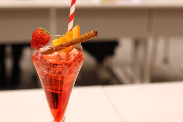 限定ドリンクは透き通った苺色のスパークリングの上にシナモンスティックとオレンジピールが飾られていて、かわいらしく春らしさも感じる仕上がり。苺のみずみずしい甘さにオレンジの香りがアクセントになっていておいしかったです。