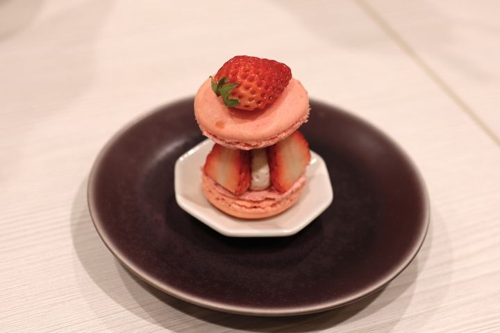 「苺のマカロン」は、マカロンの間からスライスされた苺とホイップがのぞくキュートな一品。ピンク色のマカロンも苺味で、苺の甘みとみずみずしさをたっぷり味わうことができます。