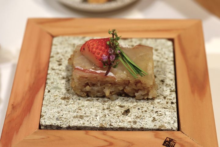 まず気になるのは、木箱におさめられた「苺と昆布〆鯛の玄米押し寿司」。お寿司に苺が乗っている! とびっくりしましたが、食べてみると甘みのある玄米と昆布の香る鯛、苺の味わいがよく合います。苺と薬味が飾られた盛り付けも華やかで、まるで会席料理の一品のような高級感あふれる逸品でした。