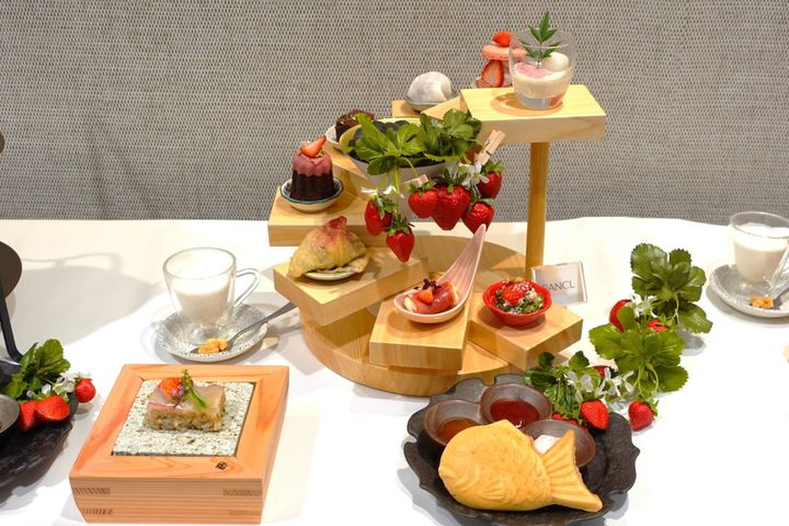 「和の苺アフタヌーンティー」は旬の苺がふんだんに使用された、和の職人が丹精をこめて作り上げたアフタヌーンティー。木のらせん型のスタンドには1段ずつ繊細なセイボリーやスイーツが乗っており、見た目からも和の雰囲気を楽しむことができます。