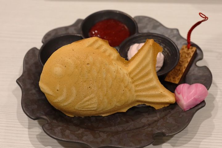 また、アフタヌーンティーでは定番のスコーンはたい焼きの形で登場。実はこのたい焼きスコーン、小麦ではなく国産玄米粉を使用しているそう。玄米由来の柔らかな甘さが、横に添えられた銀座はちみつ・苺ジャム・豆乳ホイップのトッピングとも相性ばつぐんです。