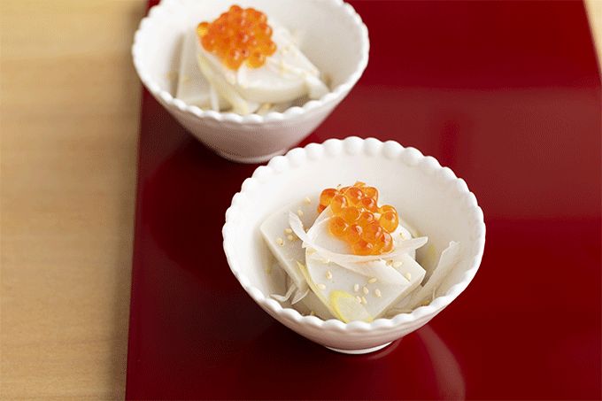 安達さん:例えば、ごま油を使ったレシピに「かまぼことネギのダブルごまあえ」があります。かまぼこをスライスして、薄切りにした長ねぎとごま油を入れて混ぜ、最後にいくらをのせていりごまを散らすだけで、お正月にもおもてなしにもピッタリの一品になります。