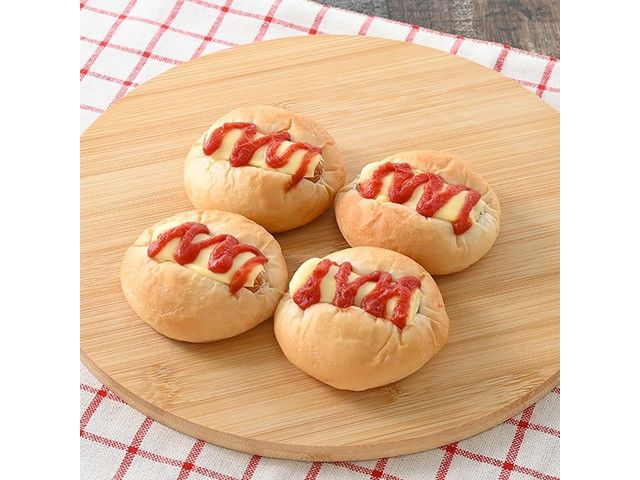 ミニウインナーをのせた生地に、マヨ風味のドレッシングとケチャップをトッピングした惣菜パン4個入りです。