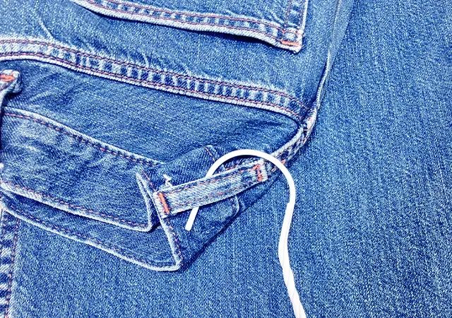 大きめの洗濯バサミを使って、ジーンズの腰回りとハンガーを挟んでみると…。
