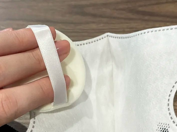 準備が整ったら、その日に使うマスクの内側に、パフでフェイスパウダーをつけていきます!
