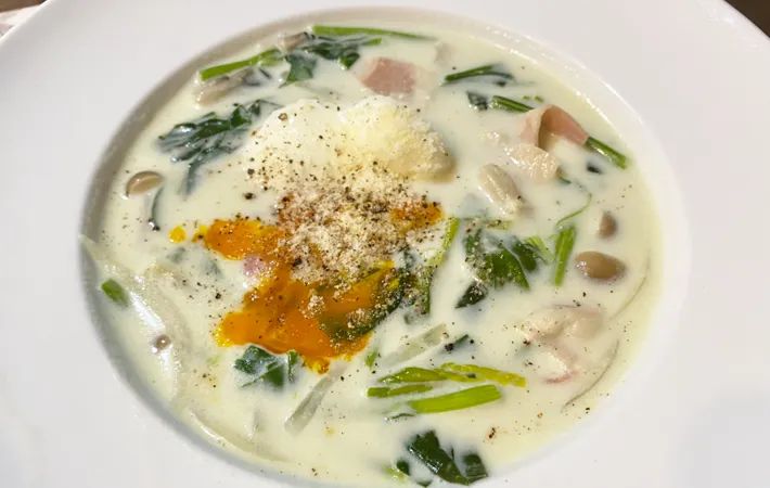牛乳と卵が混ざり合ったクリーミーなスープは、まさにカルボナーラ!