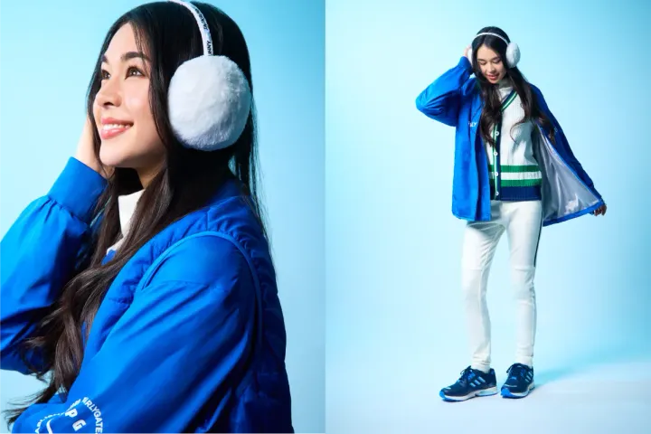快晴の日の空や海を思わせるような白×ブルーの配色。そのままだと涼しげな印象が強くなるところ、ケーブルニットやファーのイヤーマフなど、素材感で冬らしさをうまく取り入れたスタイリングです。重ね着でしっかり防寒するときは、アウターとインナーの色をリンクさせると統一感が出てまとめやすくなります。