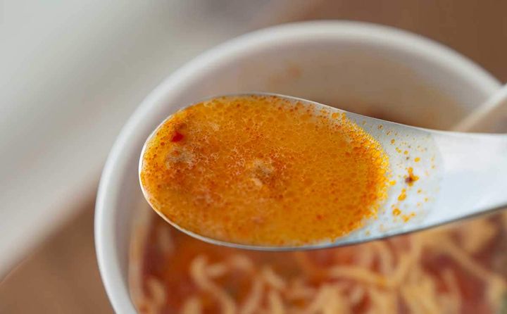 唐辛子や山椒をきかせた「田中商店」名物のトッピング「赤オニ」をイメージした本商品は、豚骨の風味をしっかりと感じるスープになっています。濃厚でコク深くまろやかな味わいのスープに、刺激的だと辛すぎない味わいが加わることで、やみつき感のあるおいしさに仕上がっていますね。湯戻し2分の極細麺は歯切れがよく、旨辛な豚骨スープとの相性もばっちりです。