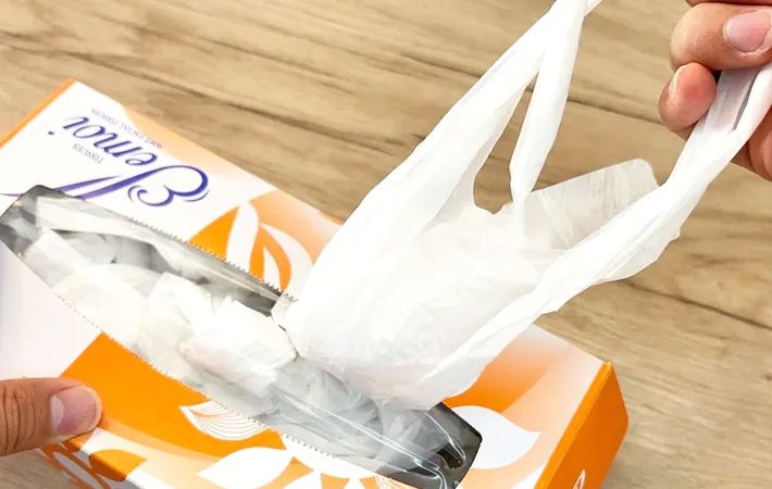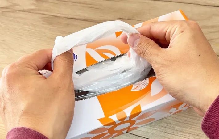 上記で折りたたんだレジ袋をティッシュ箱に入れます。箱の取り出し口から、レジ袋の持ち手を少し出しておきましょう。