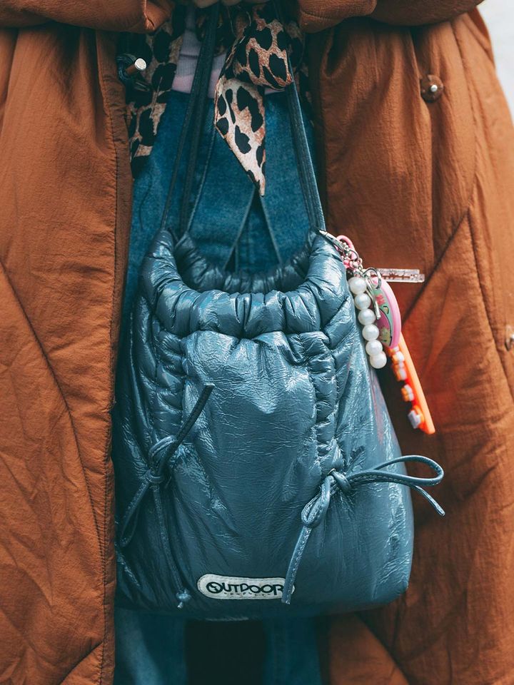 『アウトドア』のネイビーバッグでスポーティテイストをオン。カラフルなチャームをつけて、オリジナリティを出したのがグッド!
