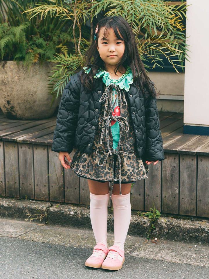 今季トレンドのレオパード柄を、ママはテラコッタのキルティングアウターと、キッズはブラックのジャケットを合わせたスタイリング。強気な柄も色味を合わせることで、浮かずにバランスよく仕上がる。