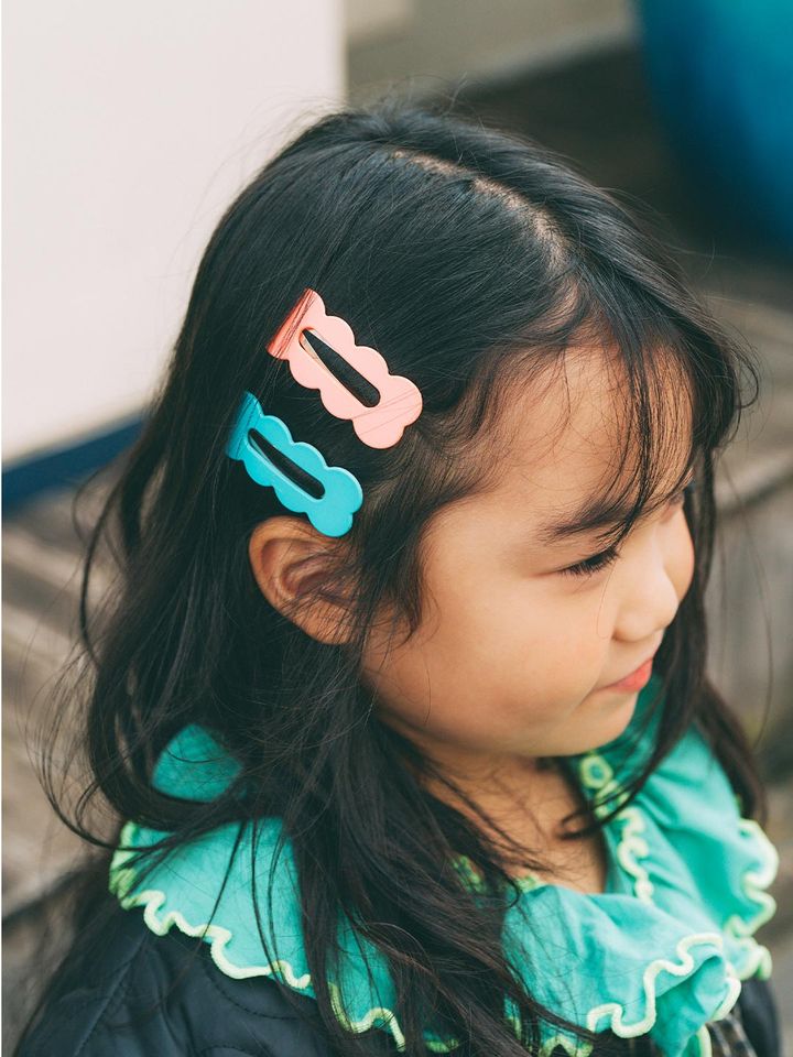 ポップなヘアアクセサリーがキュート! グリーンのフリルトップスとテンションを合わせて、遊び心ある装いに格上げ。