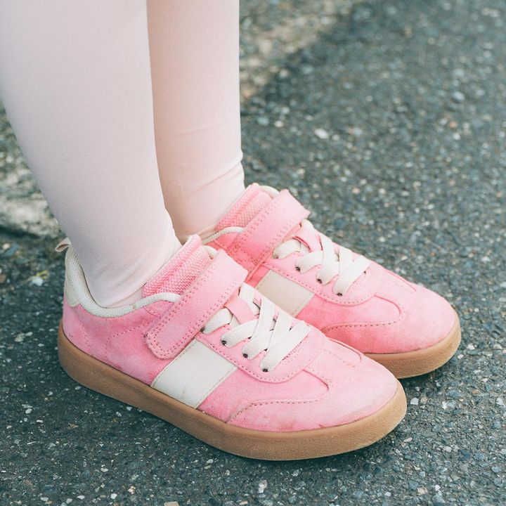優しいピンクのスニーカーがコーデの挿し色に大活躍。ホワイトのソックスと合わせて、より華やかな足元にアップデート!