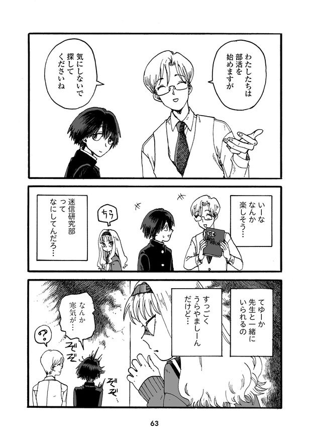 季節外れの転校生・栗丸君は新しい学校にうまくなじめず、友達をつくれずにいた。そんな彼に声をかけたのは、ミステリアスな雰囲気の教師・雨野先生。迷信や伝承を実際に試して検証する、迷信研究部の顧問である雨野先生に勧誘され、迷信研究部に入部することを決めた栗丸君。「クリスマスに豆を食べないとロバになる」「悪い子は鬼に連れて行かれて毎日酢を飲まされる」「ナメクジを窓に這わせた跡を読みとって将来の伴侶を占う」など、とんでもない迷信や伝承を次から次へと実践していく。『放課後おまじない倶楽部』で、ちょっぴり摩訶不思議な学園ライフをのぞいてみませんか?
