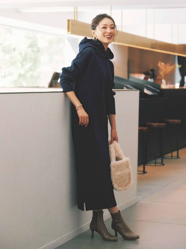 ワンピース¥5,998(リエディ)ブーツ¥31,900(ダイアナ/ダイアナ 銀座本店)ピアス¥12,100(ワンエーアールバイウノアエレ/ウノアエレ ジャパン)バッグ/スタイリスト私物