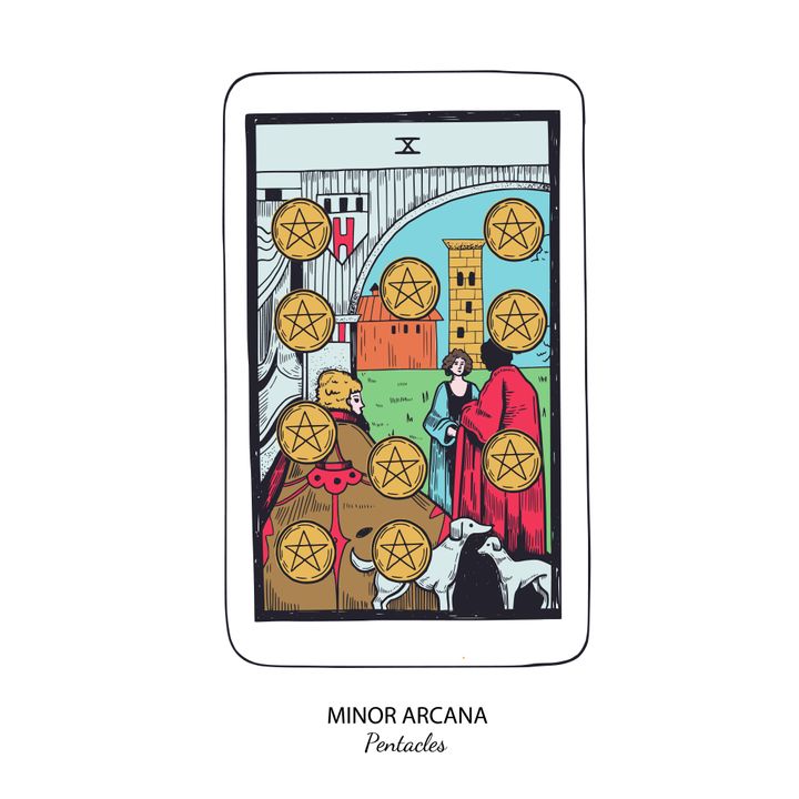 富や財産、安定した基盤や職場環境などを示唆する「ペンタクルスの10」というカード。物質的な価値や完成、ゴールといった象意もあります。 The Wild Sun / Getty Images