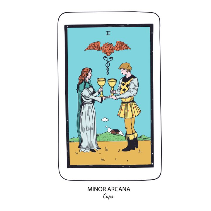 調和や愛情、パートナーシップ、相互理解を象徴する「カップの2」のカード。人間関係における心の通い合いや、そこから生まれる喜びが得られそう。 The Wild Sun / Getty Images