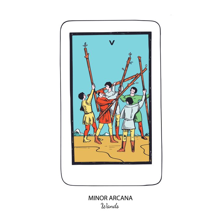 「ワンドの5」のカードは競争を意味します。自己の成長や自己研鑽、相手と切磋琢磨して、発展させていくことを暗示。 The Wild Sun / Getty Images