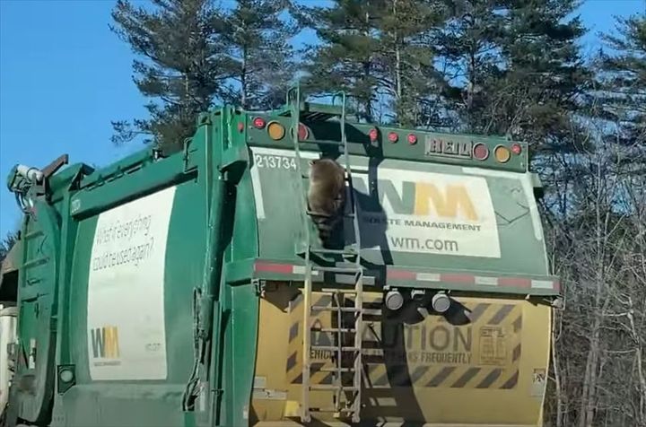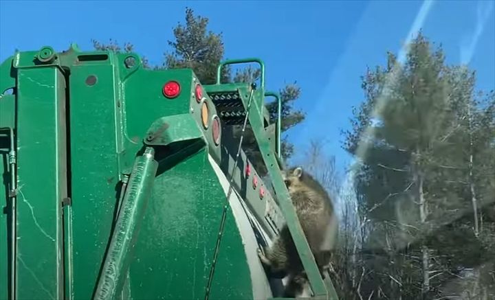 3. 高速道路でまさかのシーンを目撃!目の前を走るゴミ収集車の後ろに・・、アライグマがしがみついている!?【アメリカ・動画】
