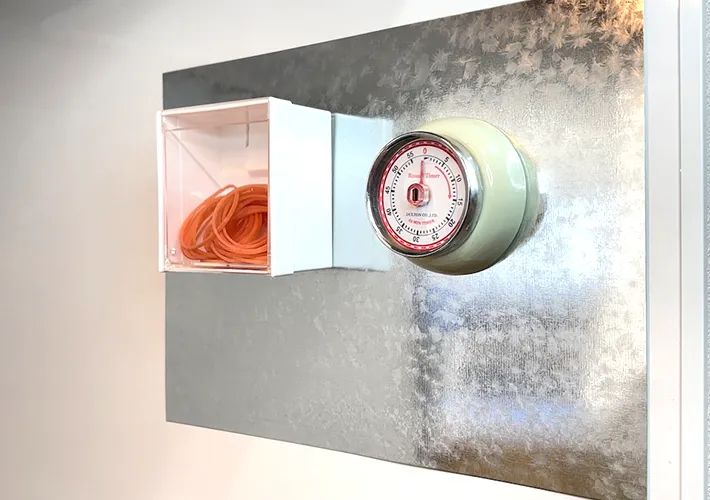 『スチールプレート』の魅力は、タイルなどマグネットがつかない場所を『マグネットが使える場所』に変えられること。