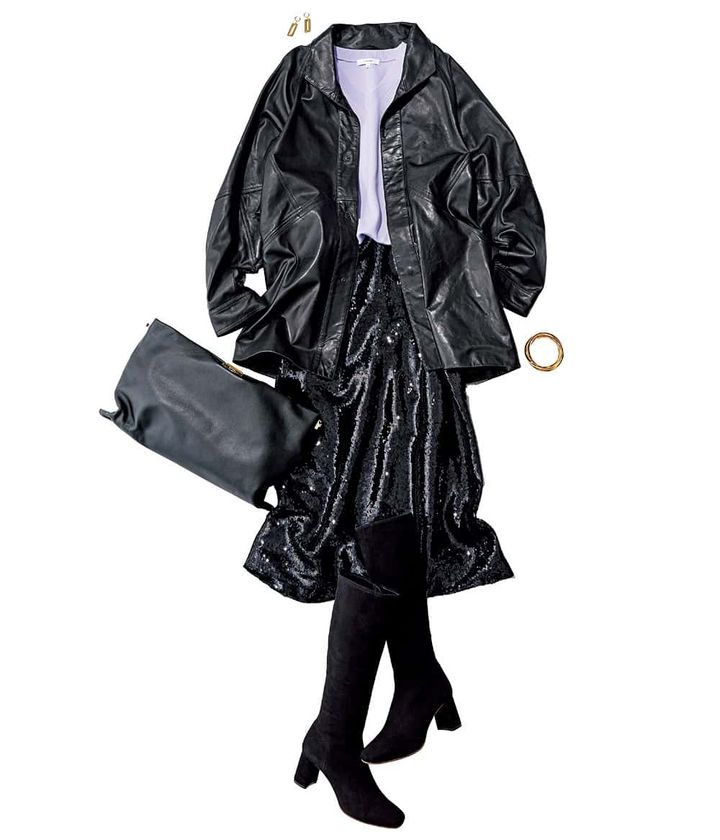 黒の強さに負けない凜々しさを〝パープル〟ニットにレザー合わせで引き立て合うスタイル。バッグやブーツの小物もシャープな黒アイテムにすると大人顔が引き立ちます。