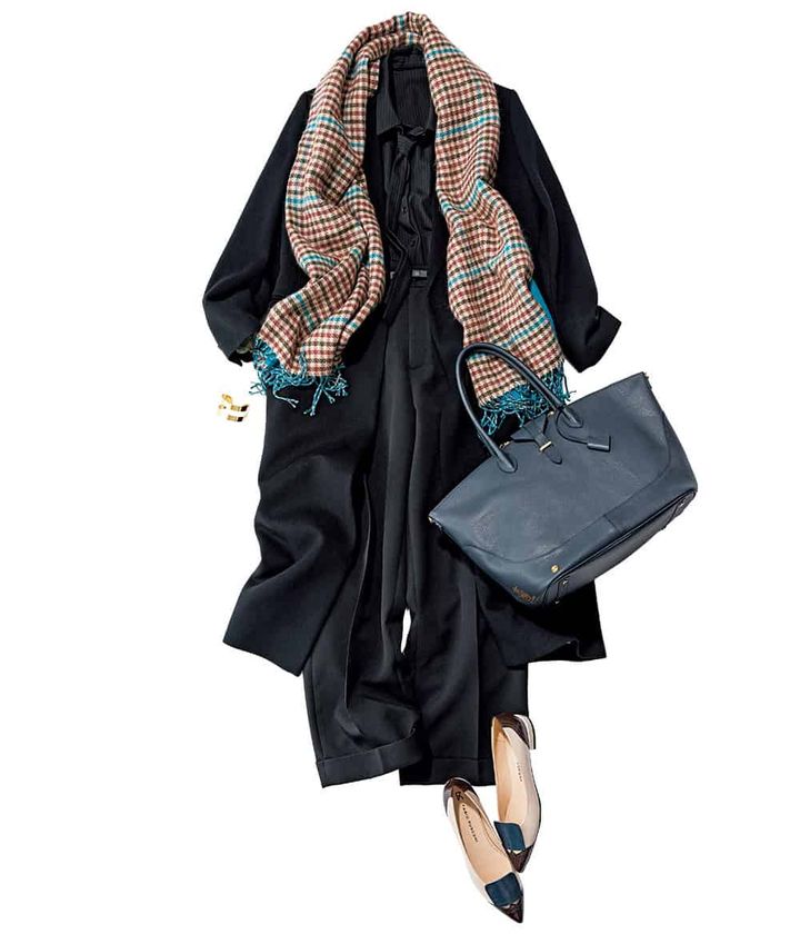 得意のマニッシュなジャケパンスタイルも、ほぼクロだと時に近寄りがたい印象に。大人顔に映える深みある色のスカーフで、黒の強さを和らげながら華やぎを。