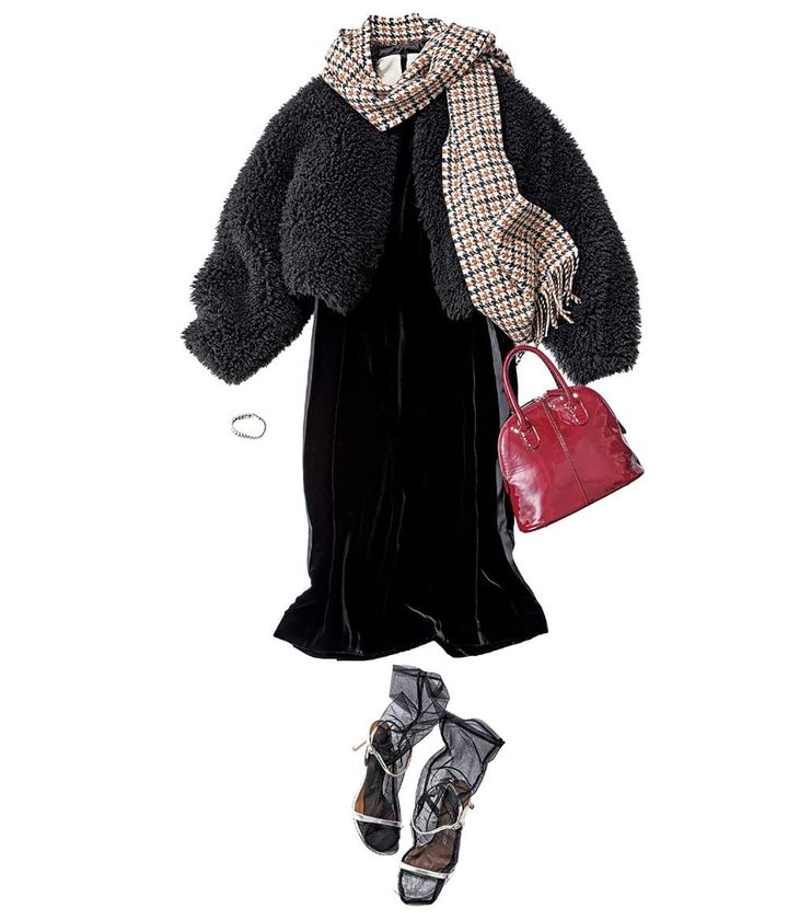 マフラー¥39,600(トラディショナル ウェザーウェア/トラディショナル ウェザーウェア 渋谷店)ボアブルゾン¥39,600(ヴェルソー/ジオン商事)ワンピース¥62,700(エッフェ ビームス/ビームス ハウス 丸の内)バッグ¥41,800(銀座かねまつ/銀座かねまつ6丁目本店)サンダル¥79,200(ペリーコ/アマン)ソックス¥1,980(靴下屋/タビオ)