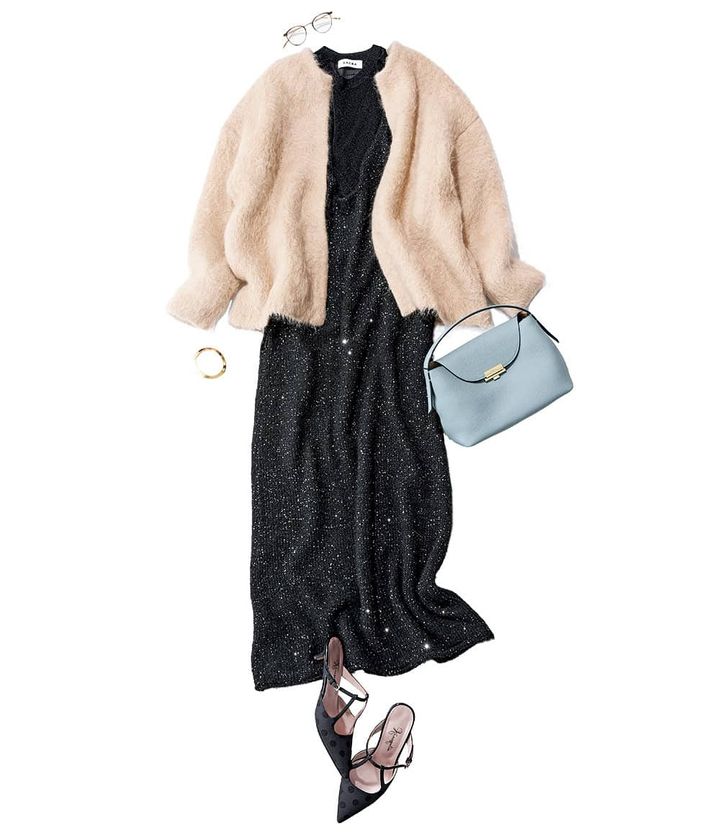 黒で煌びやかにすると夜っぽさやセクシーさが際立ち、キツく見えることもある大人曲線の顔は、視線をベージュファーに集めてほぼクロを柔らかムードに。