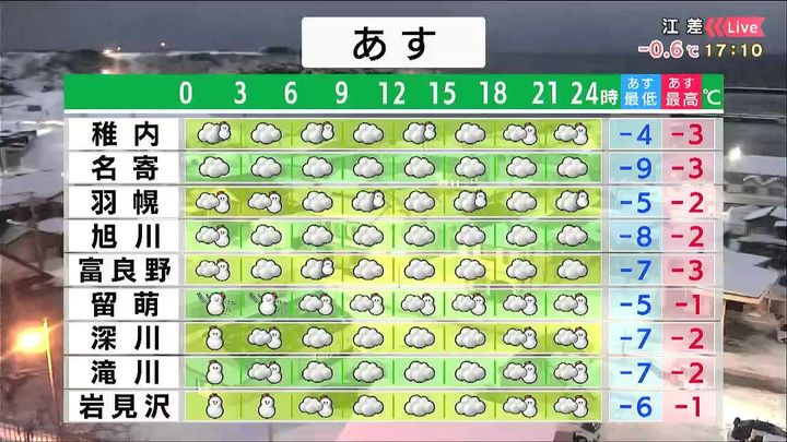 海岸部を中心に雪で、留萌周辺で10センチくらいの雪が降るでしょう。空知地方でも朝晩を中心に5センチ前後の雪が降りそうです。旭川は曇り空で割合穏やかです。