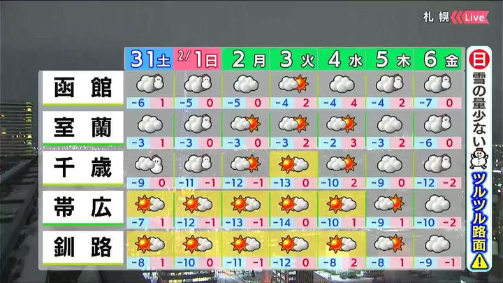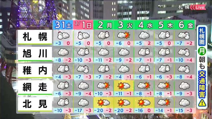 31日(土)~2月2日(月)の札幌の天気