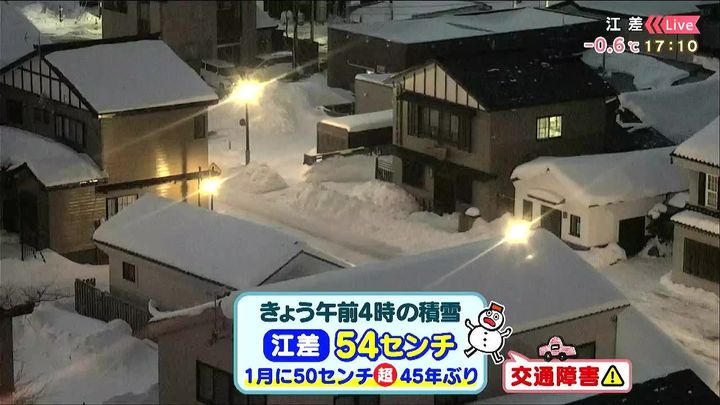 記録的な大雪になった江差では、きょう30日(金)午前4時の積雪が54センチに達しました。1月に積雪が50センチを超えるのは45年ぶりで、この時期としては異例の雪の多さです。土日も交通障害に注意して下さい。