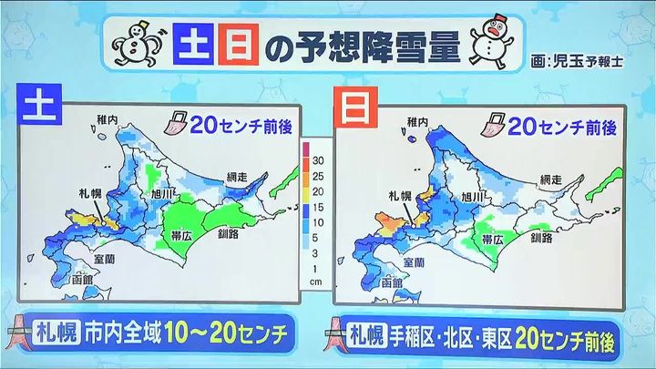 左は土曜日、右は日曜日です。どちらも札幌周辺が雪の中心です。黄色やオレンジのエリア、石狩や後志、留萌方面で土日それぞれ、20センチ前後の雪が降るでしょう。札幌の降雪量は、あす31日(土)は市内全域で10~20センチ、日曜は手稲や北区、東区を中心に20センチ前後、トータルで40センチくらいの大雪になるおそれがあります。