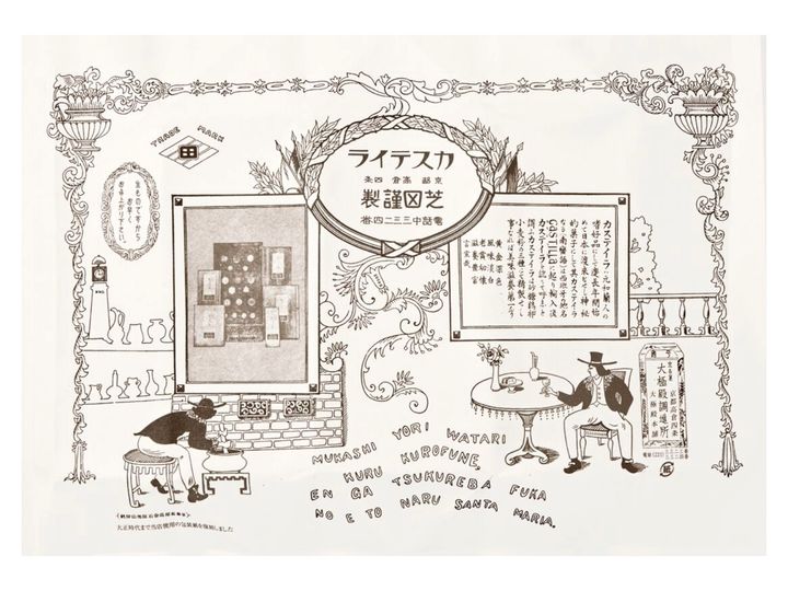 カステラの包みは大正8、9年ごろの包装紙を復刻した。「アルファベットや西洋人が描かれたデザインで和洋折衷の印象です」。印刷も「大極殿」の掛け紙は色刷りで濃淡をつけるなど手仕事が光る。