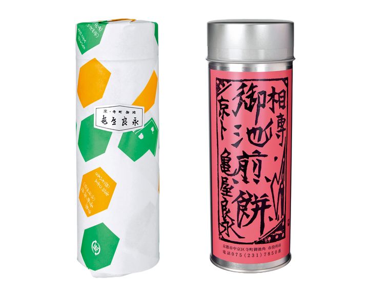白地があることで亀甲柄がきりりと引き立つ。「御池煎餅」のラベルは棟方志功作。「御池煎餅のほかに落雁『大原路』はその時々の菓銘も素敵。包みにも菓子にも引き算の美学が貫かれている老舗です」と村松さん。