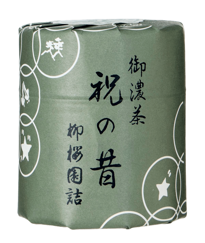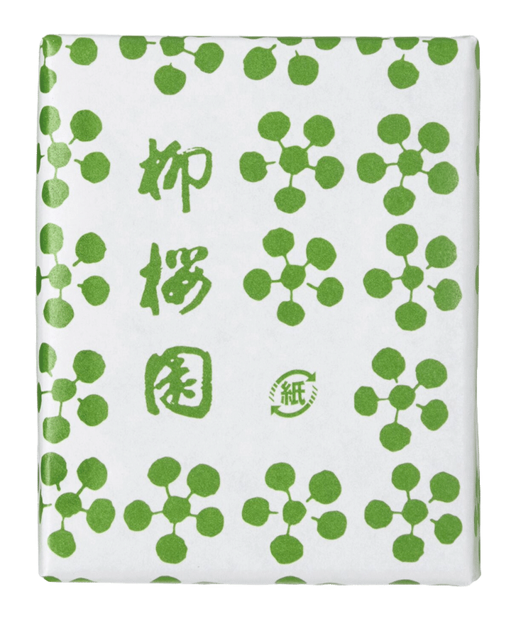 石臼で挽いた抹茶を量り売りする「柳桜園」は、宇治の専用茶園で育てた茶葉を使用。「利休梅の包み紙は抹茶の缶を包むためのもので、白地に抹茶色の梅柄はミニマムな連なりが見飽きない美しさです」