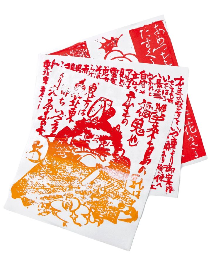 もうひとつ、店主自らが創作する場合もあります。八坂神社の石段下にある「いづ重」の恵方巻きの包みは毎年、手描きを手摺りされています。包み紙ではありませんが、青龍を描いた紙袋も大胆な余白が目を引くデザインです。