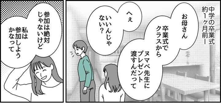 私(チサ、40代)は夫と娘(ミオカ)、息子との4人暮らし。やっと娘の高校受験が終わり、中学校の卒業式を迎えました。私は娘が自分の手を離れ始めていることを実感して、寂しい気持ちと元気に育ってくれたことへの喜びを感じています。感傷に浸るのも束の間、私が「高校の入学準備をしなきゃ!」と思っていると、娘のクラス担任、ヌマベ先生へのプレゼントをめぐってトラブルが起きてしまいました。