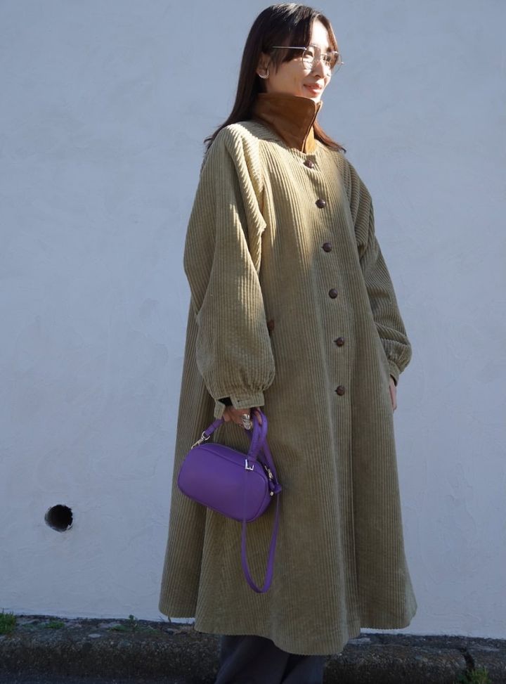 クラシカルなヴィンテージコートをモードに仕上げてくれるのは、パープルのミニバッグ。派手さもありながらどこか渋みのあるパープルなら、ヴィンテージムードにもしっくりきます。