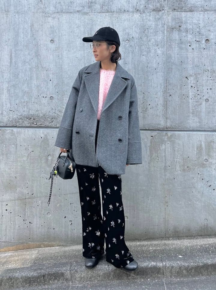 オーセンティックなグレーのコートに遊びを与えくれるピンクのモヘアニット。可愛さたっぷりなニットですが、他をモノトーンで抑えることで大人の装いにもマッチしてくれます。