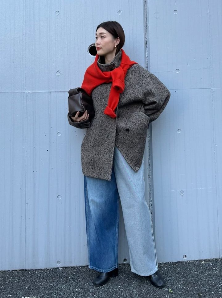 コートとデニムの王道コーデに、どこかパリシックな洒落感をプラスしてくれる赤いカーディガン。あえて肩にかけることで、コートスタイルにニュアンスが生まれます。カーデの袖は、まくっておくとスッキリ見えて◎。