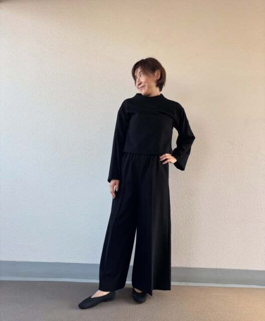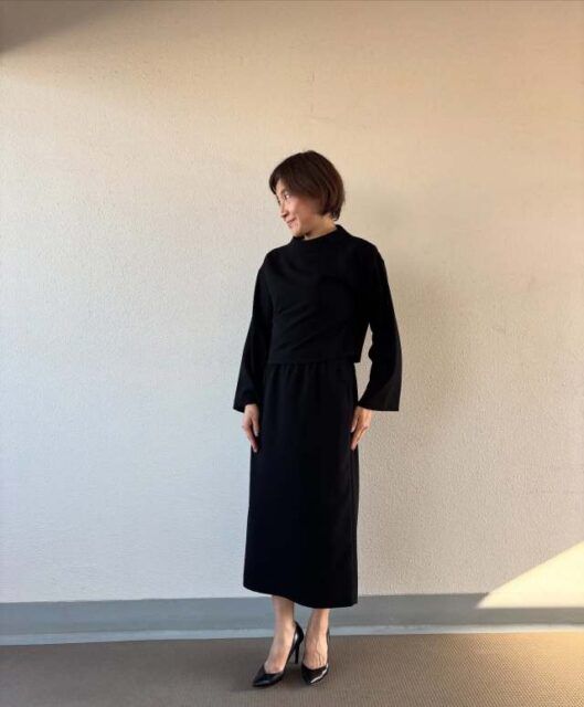 「堅苦しい服装は避けたい」「ラクな着心地がいい」、そんなママには黒のセットアップがおすすめ。ゆったりシルエットを選んでも、上下が揃っていればカジュアルに見えません。プレーンな黒パンプスを合わせるだけで大学の卒業式らしい着こなしに。