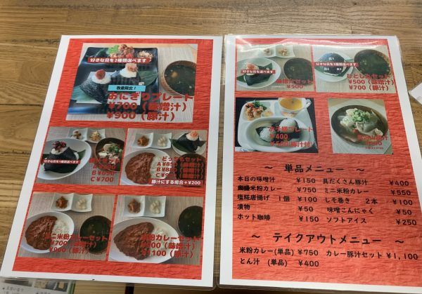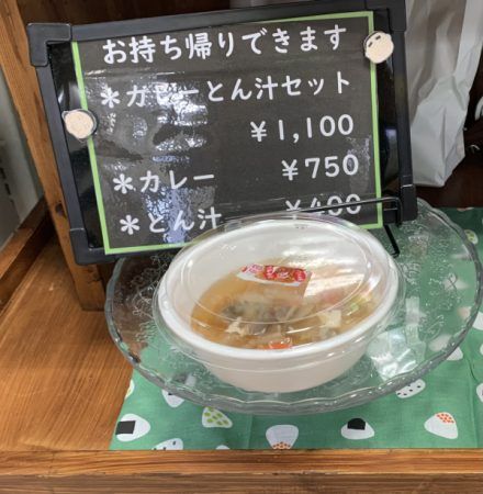 おにぎり1個と豚汁のセット、米粉カレーと汁物のセット、どっちもセット、などなど。 お子様セットもあるのね~。 迷います~。
