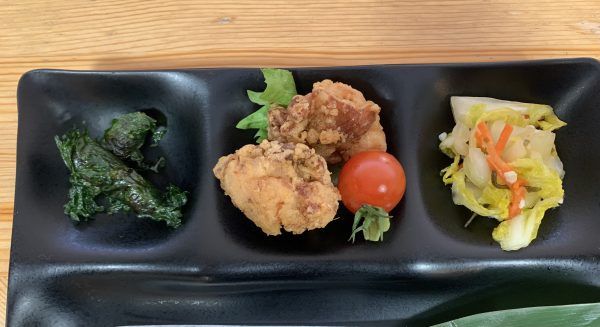 付け合わせも美味しい! しそ巻き味噌、鶏の唐揚げ、お漬物。