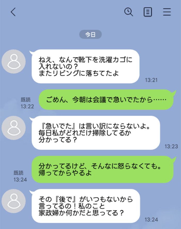 妻:「その『後で』がいつもないから言ってるの! 私のこと、家政婦か何かだと思ってる?」