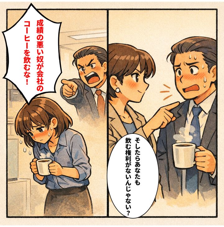 「あら、そしたらあなたも飲む権利がないんじゃない?その理屈で言うなら、課長。あなたも今すぐそのカップを置きなさい。あなたが先月出した発注ミスの損失、このコーヒー何万杯分になるか計算してあげましょうか?」