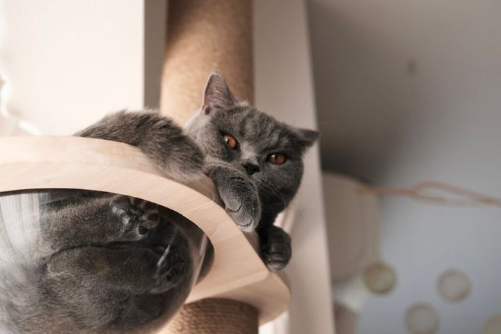 ロボット掃除機が動きだすと、ぼくはすぐにキャットタワーへ避難。こわいけど、監視は続けます。これもぼくのお仕事です。