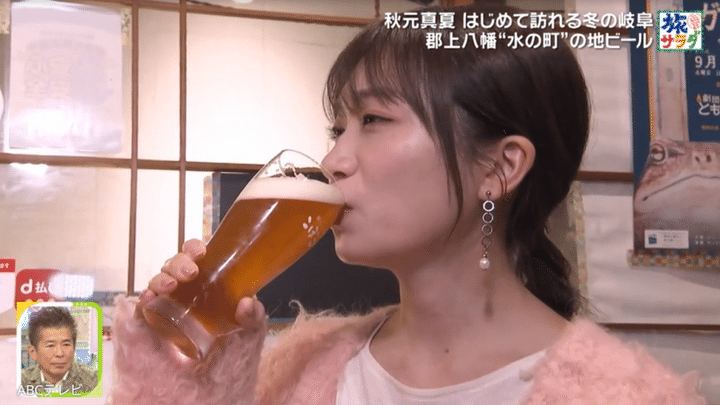 『朝だ!生です旅サラダ』では、秋元が冬の岐阜県を旅したVTRが公開された。実は彼女は、「毎晩必ず1杯は飲む」というほどビールが大好き。郡上八幡の名水仕込みクラフトビールを昼から味わった秋元は、「おいしいっ!」と瞳を輝かせて感激! 「深みだけじゃなくて、ちょっとふわっとした華やかな感じとか、柔らかさもあって、すごく飲みやすいのに飲みごたえみたいなものもあります!」と的確にリポートした。