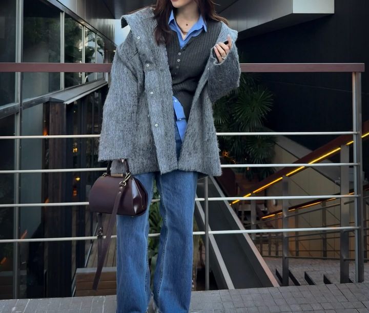 北風が冷たいこの時期、おしゃれと防寒を両立させたい40代にぴったりなのがasamimiiiiさんの軽くて暖かいグレーのシャギーコートを主役にした着こなし。ゆったりとしたボリュームのあるシルエットは、中に着込んでも着膨れしにくく、首元まで閉めれば防寒対策も万全です。インナーには鮮やかなブルーのシャツを差し色として投入し、顔まわりを華やかな印象に仕上げています。